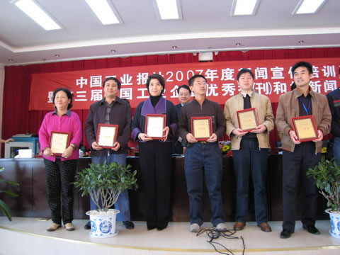 本報訊 日前,在云南省大理市召開的中國工業(yè)報社2007年度新聞宣傳培訓班暨第三屆中國工業(yè)企業(yè)優(yōu)秀報刊和好新聞領獎大會上,我《杭機集團報》被評為中國工業(yè)企業(yè)2007年度優(yōu)秀報刊一等獎,其獲獎語是:欄目豐富、形式活潑、文章短小精悍,并出版中德雙語報,便于外籍專家了解企業(yè)動態(tài)。本報記者陳烈新采寫的《首席工程師加冕儀式在中科院杭州科技園舉行》報道,榮獲好新聞(消息)評選二等獎,這反映了我集團重視人才隊伍建設引起了媒體的關注和肯定。集團公司黨委書記董事長朱金根獲悉,當即給出席頒獎會的主編王忠民發(fā)賀訊:“祝賀你,并與你們共享榮譽和喜悅!”